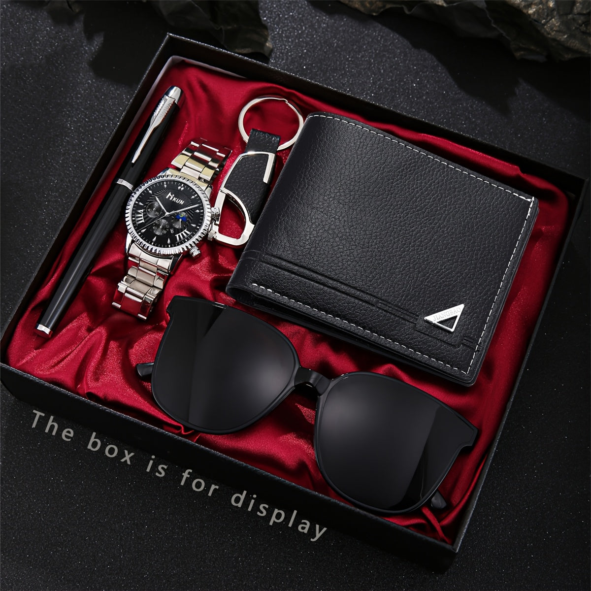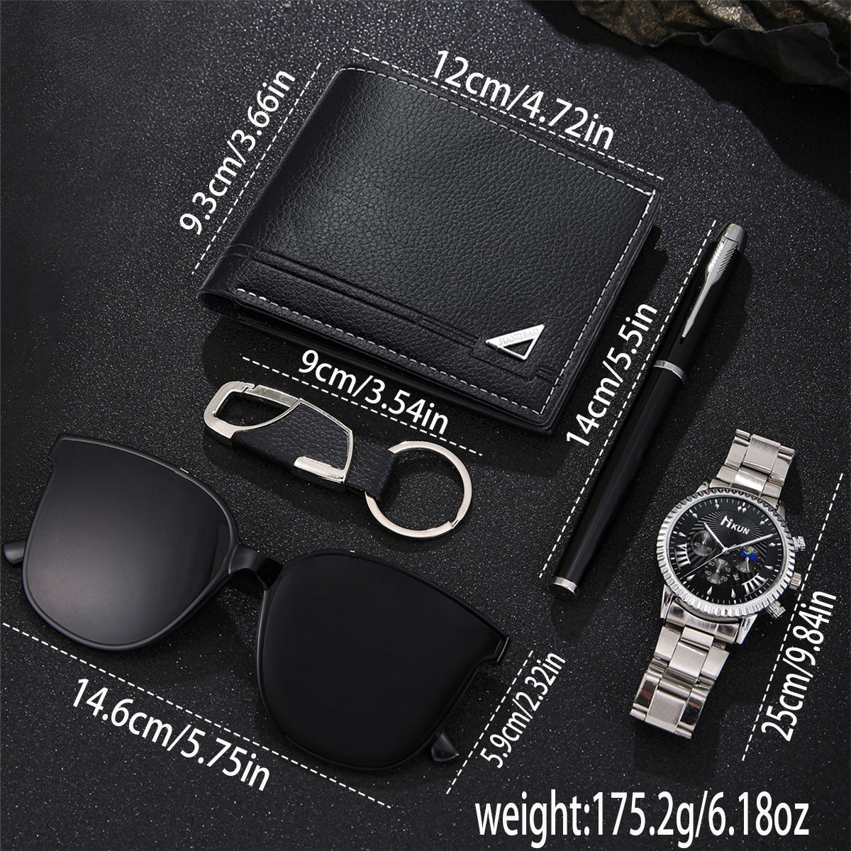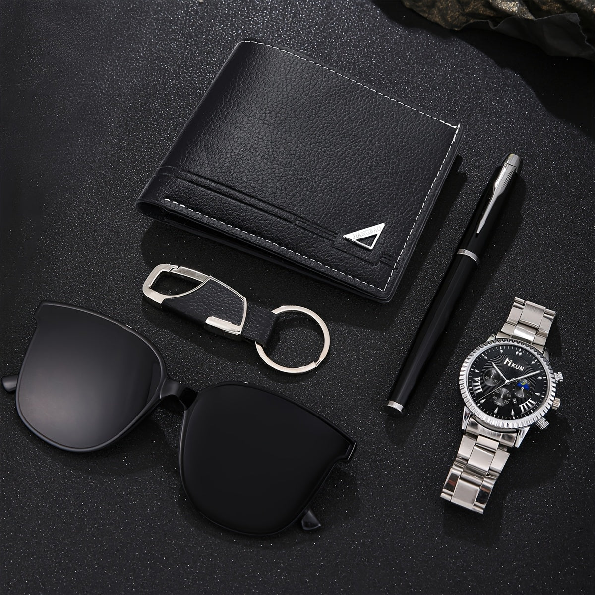 5pcs Stylish Business Casual Men's Quartz Watch Set with Wallet, Glasses, Keychain & Pen